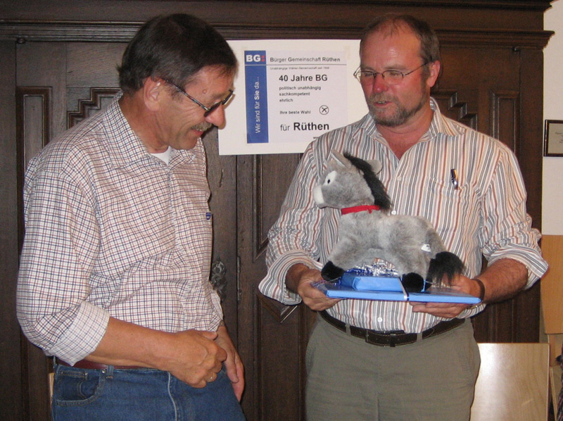 Aus Dankbarkeit für seine Tätigkeiten auch im Vorstand überreichte ihm die BG Rüthen als Präsent den neuen Bildband der Stadt Rüthen und ihrer Ortsteile, sowie als Besonderheit einen Rüthener Plüsch-Esel, damit er sich noch lange an die politische Arbeit erinnert.