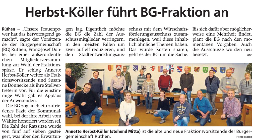 Rüthen - Unsere Frauenpower hat das hervorragend gemacht“, sagte der Vorsitzende der Bürgergemeinschaft (BG) Rüthen, Franz-Josef Dohle, bei einer außerordentlichen Mitgliederversammlung zur Wahl der Fraktionsspitze. Er schlug Annette Herbst-Köller weiter als Fraktionsvorsitzende und Susanne Dönnecke als ihre Stellvertreterin vor. Für die einstimmige Wahl gab es Applaus der Anwesenden.