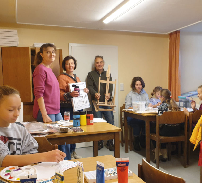 Eine 500 Euro Spende durch die BG wurde genutzt, um Staffeleien, Leinwände, Pinsel und Farben anzuschaffen. Mit diesen Malutensilien lernen nun geflüchtete Kinder aus der Ukraine in einer Malschule, die eine aus Charkiw geflüchtete Lehrerin leitet, malen und zeichnen.